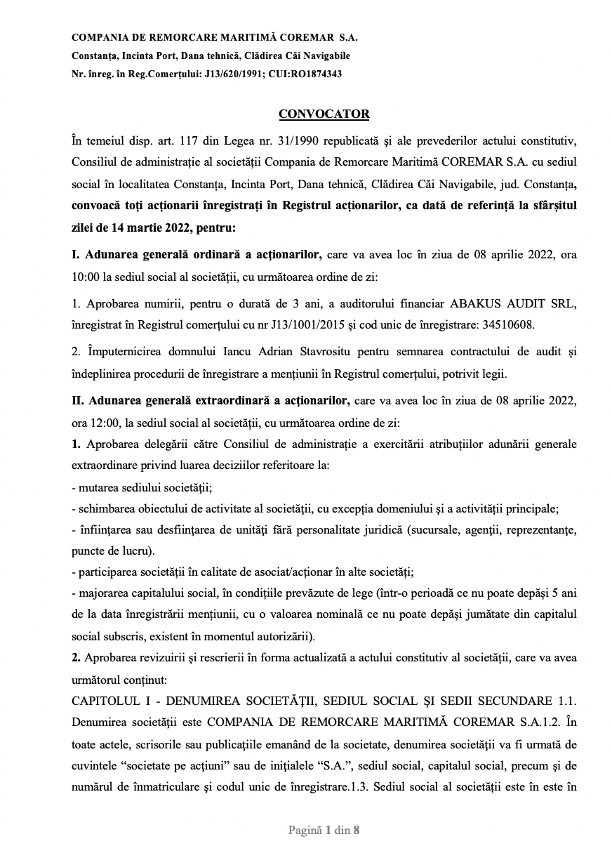 CN APMC, cu sediul in mun. Constanta, incinta Port Constanta, Gara Maritima, judetul Constanta anunta publicul interesat asupra depunerii solicitarii de emitere a acordului de mediu pentru S.C. COREMAR S.A., pentru proiectul "CONSTRUIRE HALA - CENTRU TRANSFER TEHNOLOGIC", propus a fi amplasat in incinta Port Constnata, parcela S2, Dig de Larg, jud. Constanta. Informatiile privind proiectul propus pot fi consultate la sediul Agentiei pentru Protectia Mediului CONSTANTA, str. Unirii, nr. 23, Constanta, judetul Constanta, zilnic, intre orele 9-13 si la domiciliul beneficiarului Incinta Port, DANA TEHNICA, cladirea Cai Navigabile, Jud. Constanta, in zilele de luni-vineri, intre orele 9-13. Observatiile publicului se primesc zilnic la sediul Agentiei pentru Protectia Mediului CONSTANTA, str. Unirii, nr. 23, Constanta, judetul Constanta, intre orele 9-13.